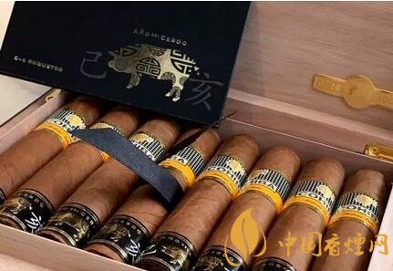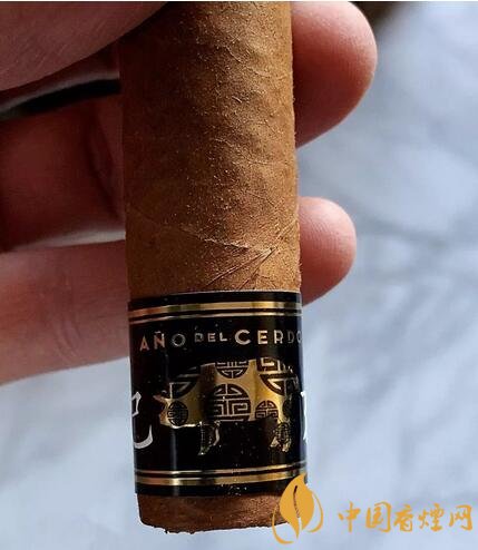 高希霸生肖雪茄并非特制的雪茄,使用的是醇化數(shù)年的量產(chǎn)雪茄,例如去年的高希霸狗年魔術(shù)師使用的是老標(biāo)的高希霸魔術(shù)師,今年的高希霸羅布圖同樣使用醇化數(shù)年的雪茄。雪茄尺寸是50環(huán)徑,4.7英寸,今年的發(fā)行量是3000盒。雪茄有兩個(gè)煙標(biāo),一個(gè)是高希霸的標(biāo)準(zhǔn)煙標(biāo),一個(gè)是帶有中國(guó)生肖豬年標(biāo)識(shí)的腳標(biāo),雪茄盒子也是特制的,黑色漆盒右下角有一個(gè)豬的標(biāo)識(shí)。