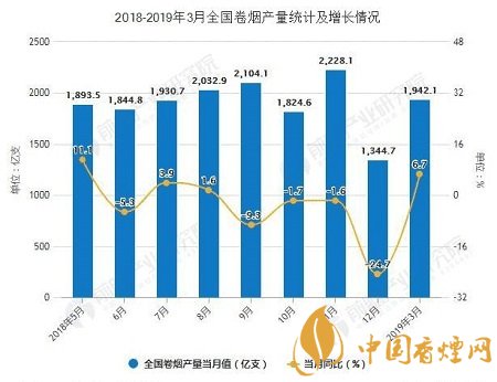 2018年全年全國(guó)卷煙累計(jì)產(chǎn)量23356.2億支,累計(jì)下降0.4%。截止至2019年3月全國(guó)卷煙產(chǎn)量為1942.1億支,同比增長(zhǎng)6.7%。累計(jì)方面,2019年1-3月全國(guó)卷煙產(chǎn)量累計(jì)達(dá)到6911.3億支,同比增長(zhǎng)7.8%。