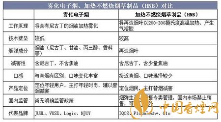 新型煙草是一種具備減害效果的尼古丁傳遞系統(tǒng),其煙氣中的有害物質,如焦油、一氧化碳等,含量遠低于傳統(tǒng)卷煙。新型煙草可分為霧化電子煙、加熱不燃燒煙草制品(HeatNotBurning,HNB)兩大類,其中霧化電子煙又包括封閉式(霧化室為封閉系統(tǒng),換彈式)和開放式(霧化室為開放系統(tǒng),注油式)兩種。霧化電子煙和HNB的差異性主要體現(xiàn)在工作原理、煙彈成分、產(chǎn)品定位等方面。