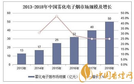 據(jù)統(tǒng)計,2013-18年國內霧化煙市場規(guī)模CAGR為+30%,2018年國內霧化電子煙市場規(guī)模約50億元,同比增長25%。