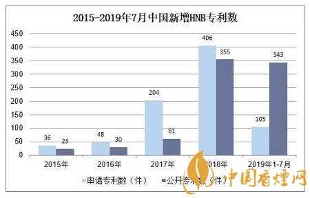 2016-2018年國內HNB專利共計830件,其中2017年、2018年、2019年1-7月年新增HNB卷煙專利數(shù)(公開口徑)分別約為61件、355件、343件,技術推進加快。