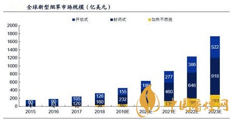 與傳統(tǒng)卷煙市場衰退呈鮮明對比的是新型煙草市場規(guī)模的逐年提升。全球新型煙 草市場規(guī)模以 27.9%的復(fù)合年增長率從 2013 年的 94 億美元迅速增加至 2018 年的 323 億美元。弗若斯特沙利文預(yù)計到 2023 年全球新型煙草市場規(guī)模將高達 1734 億美元。新型煙草煙作為一種替代香煙的電子產(chǎn)品,有著與香煙類似的外 觀、煙霧、味道和感覺。而與香煙相比卻不含有香煙煙霧中的 7000 種有害化學 成分,因此受到越來越多人的青睞。