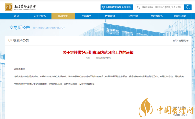8月5日,上金所發(fā)布公告稱,近期黃金價格創(chuàng)歷史新高,白銀價格持續(xù)高位大幅波動。請各會員單位繼續(xù)提高風險防范意識,做細做好風險應急預案,提示投資者做好風險防范工作,合理控制倉位,理性投資。