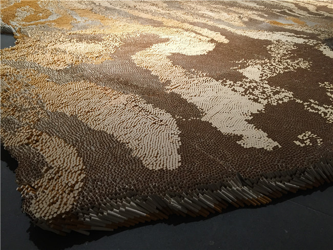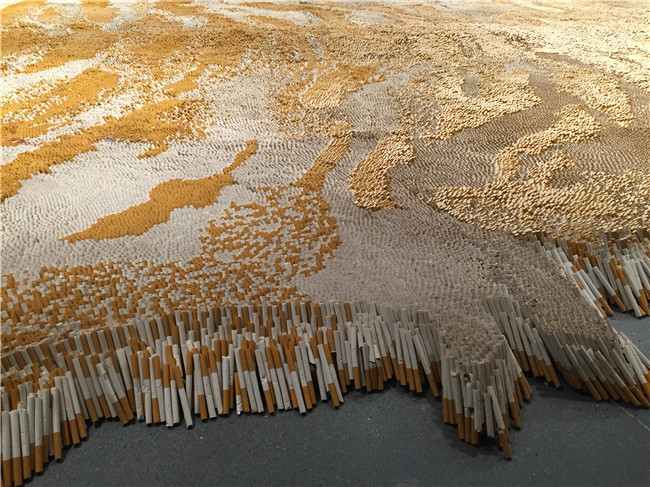 這件巨大而厚實(shí)的“虎皮地毯”鋪陳,是由50萬支重達(dá)440磅的香煙按照特殊的排列組成的驚人之作。為了突出全球貿(mào)易、包裝和人們是如何被致命的吸煙習(xí)慣所誘惑,56歲的徐冰經(jīng)過十年探索花上十年的時(shí)間去制作……,最終創(chuàng)作出此作品。