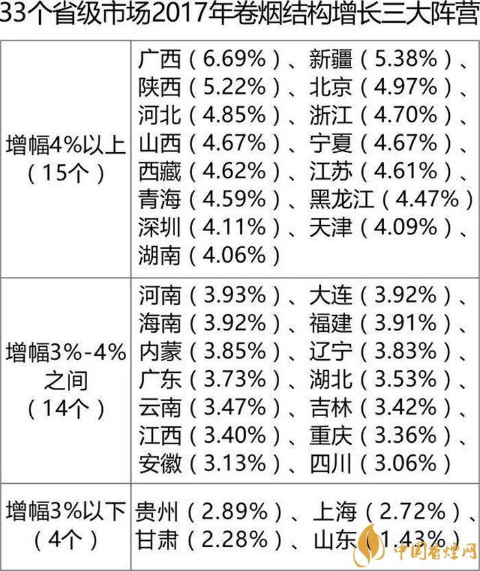 結(jié)構(gòu)升級既是行業(yè)所愿,也是大勢所趨。其中,有幾個值得進(jìn)一步觀察的現(xiàn)象:一是單箱值邁入3萬元的省級市場已達(dá)15個,總體以華東、華南、西南兩大區(qū)域為主(北方只有北京市)。二是一類煙成為結(jié)構(gòu)提升的主動力,全年一類卷煙銷量1058.60萬箱,同比增加70.35萬箱,增長7.11%。三是有8個省級市場單箱結(jié)構(gòu)同比增加值沒有達(dá)到1000元,分別是山東、甘肅、吉林、貴州、遼寧、四川、內(nèi)蒙和黑龍江,其中,山東煙民消費(fèi)最不給力,僅增加360元。四是結(jié)構(gòu)最高的仍然是浙江,單箱值達(dá)到43663元,最低的仍然是河北,單箱值為22375元,相差接近一倍。