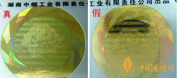 ②迎光觀察激光全息圖案:真品卷煙圖案內拼音字母、芙蓉花及“芙蓉王”轉換不同角度,都會呈現不同圖案的切換,且層次清晰、字體完整;假冒卷煙無論如何轉換角度,都無法達到完美切換,字體模糊,圖案缺失嚴重。