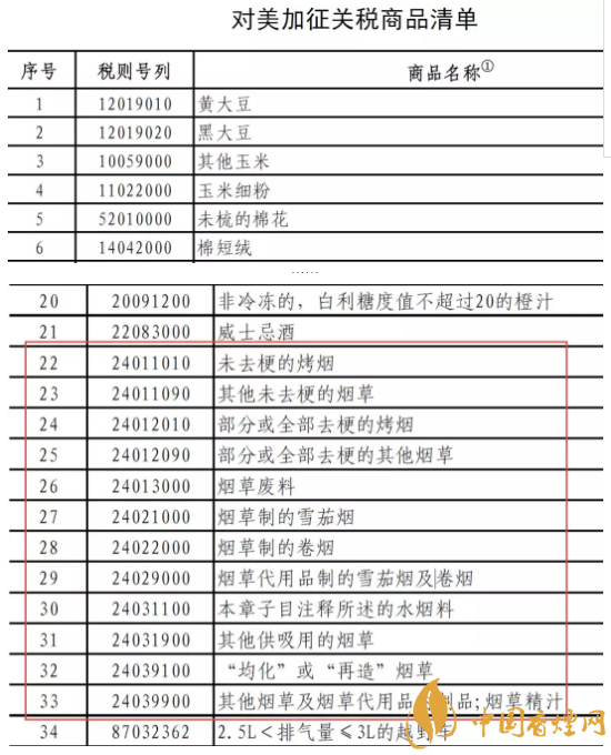 最近兩周中美貿(mào)易戰(zhàn)成為全球關(guān)注焦點(diǎn)。截止到目前雙方過招三回合,這場(chǎng)拉鋸戰(zhàn)中,2018中美貿(mào)易戰(zhàn)最新消息:細(xì)心的網(wǎng)友注意到,有12項(xiàng)煙草制品及原料出現(xiàn)在對(duì)美加征關(guān)稅商品清單中。下面香煙網(wǎng)小編為大家整理介紹。