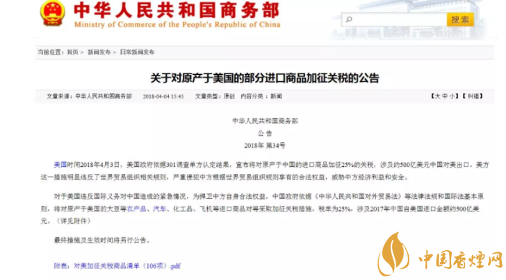 隨著中美貿(mào)易戰(zhàn)的不斷升級(jí),從受限清單的第一頁,煙民們酒看到了煙草生產(chǎn)過程中涉及的未去??緹?、其他去梗煙草、煙草制的雪茄煙、煙草制的卷煙等產(chǎn)品。為捍衛(wèi)中方自身合法權(quán)益,中國政府依據(jù)《中華人民共和國對(duì)外貿(mào)易法》等法律法規(guī)和國際法基本原則,對(duì)原產(chǎn)于美國的進(jìn)口商品對(duì)等采取加征關(guān)稅措施,稅率為25%,涉及2017年中國自美國進(jìn)口金額約500億美元。