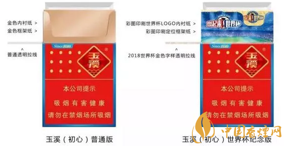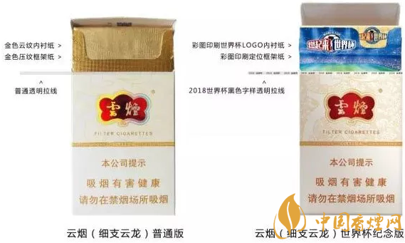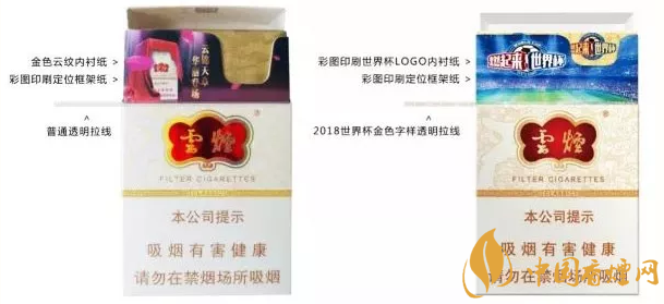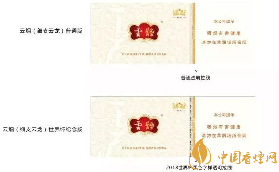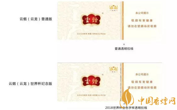 大家可能也了解國產(chǎn)中高檔香煙價格表和圖片,云煙占據(jù)主要市場。本次世界杯版對以下產(chǎn)品的條盒、小盒進(jìn)行了局部改版調(diào)整,具體調(diào)整:小盒翻蓋內(nèi)定位卡紙印刷世界杯元素、小盒內(nèi)襯紙彩圖印刷世界杯元素、小盒拉線增加“2018世界杯”金色字樣、條盒拉線增加“2018世界杯”金色字樣。下面一起來看看細(xì)節(jié)對比圖吧。