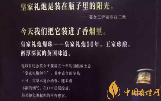 10支皇家禮炮50年爆珠:皇家禮炮50年爆珠提取自紀(jì)念英國女王登基50年的國釀威士忌,其中富含堅(jiān)果、可可、雪梨木復(fù)合的酒香,隨著柔滑豐潤的煙氣,在口中層層綻放,輕柔的包裹消費(fèi)者的所有感官。