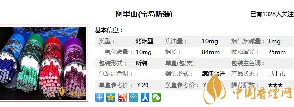 這款阿里山1905鐵罐裝香煙其實就是,阿里山(寶島聽裝),這款香煙作為“阿里山”旗下又一款獨(dú)具特色的臺灣高檔烤煙型卷煙,無論從它的外觀還是它的特色來講,這款香煙都有著它的獨(dú)到之處,那么在介紹阿里山香煙1905鐵罐價格圖片之前,先來看一看這款阿里山1905多少錢一罐,這款香煙的參考價為20元/罐。