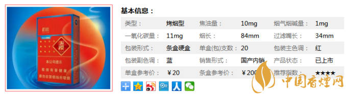 煙長:84mm 過濾嘴長:34mm 包裝形式:條盒硬盒 單盒(包)支數(shù):20