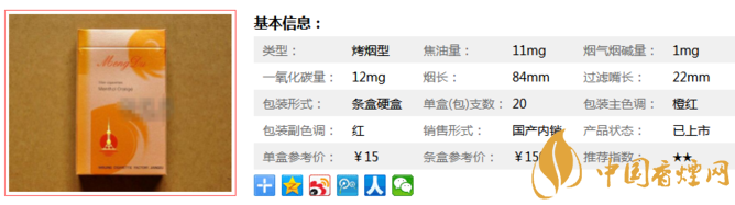 | 類型 :烤煙型 | 焦油量 :11mg | 煙氣煙堿量 :1mg | 一氧化碳量 :12mg |