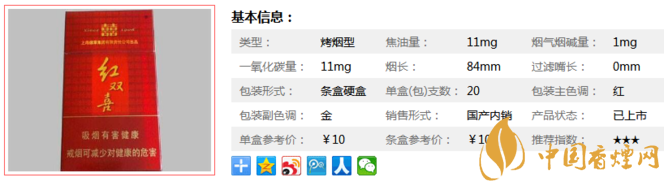 “百順”紅雙喜運(yùn)用了特殊的保潤技術(shù),確保煙香和水份不會(huì)隨煙包打開而過快流失,燃燒速度不快,煙支也不易折斷。下面我們一起來看紅雙喜硬百順香煙的參數(shù)信息:焦油量:11mg 煙堿量:1mg 一氧化碳量:11mg