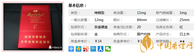該產(chǎn)品選用醇化而具有獨(dú)特香氣的國內(nèi)外優(yōu)質(zhì)原料,輔于天然植物精華香精香料,依托紅塔集團(tuán)技術(shù)中心雄厚的技術(shù)力量,運(yùn)用當(dāng)前業(yè)內(nèi)先進(jìn)的生物減害制劑和激光打孔技術(shù),突出“高科技、高香氣、低焦油、低危害”的風(fēng)格特點(diǎn)。下面我們一起來看白沙尚品紅的參數(shù)信息:焦油量:11mg. 煙堿量:1mg. 一氧化碳量:12mg.