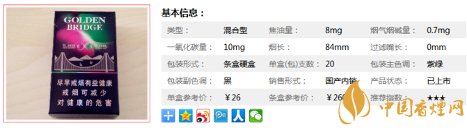 | 類型 :混合型 | 焦油量 :8mg | 煙氣煙堿量 :0.7mg | 一氧化碳量 :10mg |