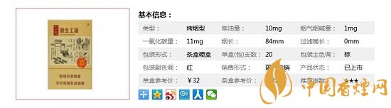 | 類型 :烤煙型 | 焦油量 :10mg | 煙氣煙堿量 :1mg | 一氧化碳量 :11mg |