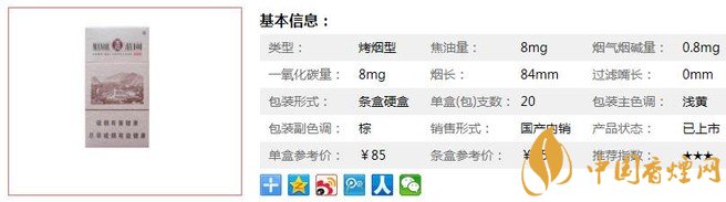 | 類(lèi)型 :烤煙型 | 焦油量 :8mg | 煙氣煙堿量 :0.8mg | 一氧化碳量 :8mg |