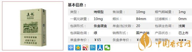 | 類(lèi)型 :烤煙型 | 焦油量 :10mg | 煙氣煙堿量 :1mg | 一氧化碳量 :10mg |