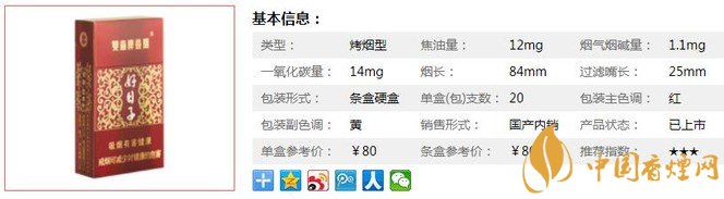 | 煙長(zhǎng):84mm | 過(guò)濾嘴長(zhǎng):25mm | 包裝形式:條盒硬盒 | 單盒(包)支數(shù):20 |