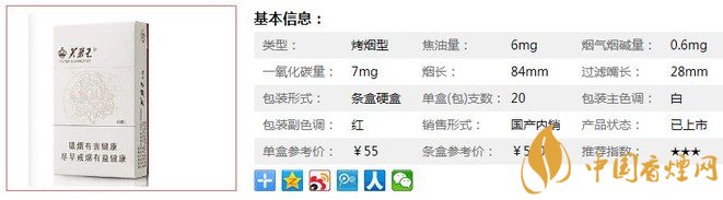 | 類(lèi)型 :烤煙型 | 焦油量 :6mg | 煙氣煙堿量 :0.6mg | 一氧化碳量 :7mg |