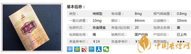 類型 :烤煙型 焦油量 :10mg 煙氣煙堿量 :1.1mg 一氧化碳量 :12mg