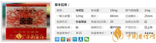 雙喜和喜煙支長84mm,過濾嘴長25mm,針對(duì)消費(fèi)者口味特點(diǎn)構(gòu)建了新的研發(fā)平臺(tái),綜合運(yùn)用了調(diào)香最新技術(shù),進(jìn)一步強(qiáng)化卷煙“甜、柔、順”的上乘品質(zhì)特點(diǎn)。下面我們一起來看雙喜和喜的參數(shù)信息:焦油量:10mg. 煙堿量:1mg. 一氧化碳量:12mg.