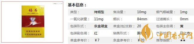 鉆石硬大福元煙支長(zhǎng)84mm,過濾嘴:25mm,“鉆石(硬大福元)”甄選云貴優(yōu)質(zhì)上等煙葉,采用最新配方技術(shù)調(diào)配而成。煙絲精細(xì)飽滿,口感醇厚,焦油量穩(wěn)定,無刺鼻嗆喉的情況。下面我們一起來看鉆石硬大福元的參數(shù)信息:焦油量:10mg 煙堿量:1mg 一氧化碳量:11mg