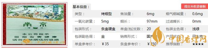 | 類(lèi)型 :烤煙型 | 焦油量 :6mg | 煙氣煙堿量 :0.6mg | 一氧化碳量 :5mg |