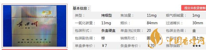 | 煙長(zhǎng):84mm | 過(guò)濾嘴長(zhǎng):30mm | 包裝形式:條盒硬盒 | 單盒(包)支數(shù):20 |