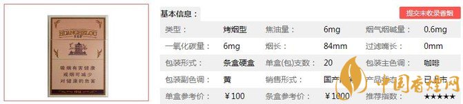 類型 :烤煙型 焦油量 :6mg 煙氣煙堿量 :0.6mg 一氧化碳量 :6mg