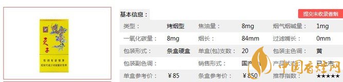 類型 :烤煙型 焦油量 :8mg 煙氣煙堿量 :1mg 一氧化碳量 :8mg