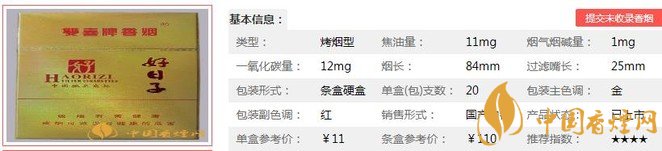 | 類型 :烤煙型 | 焦油量 :11mg | 煙氣煙堿量 :1mg | 一氧化碳量 :12mg |