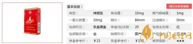 | 類型 :烤煙型 | 焦油量 :10mg | 煙氣煙堿量 :1mg | 一氧化碳量 :10mg |