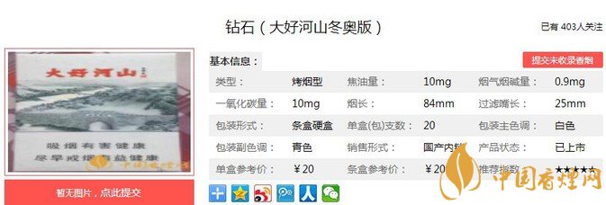 眾所周知,2022年的冬奧會舉辦城市是北京和河北的張家口。所以做為主辦城市之一的省品牌香煙,勢必會要在煙草上為冬奧做下宣傳的。這是一款非賣款,很有收藏紀念價值。但經(jīng)香煙網(wǎng)小編市場調(diào)查鉆石大好河山冬奧版售價為20元/包。