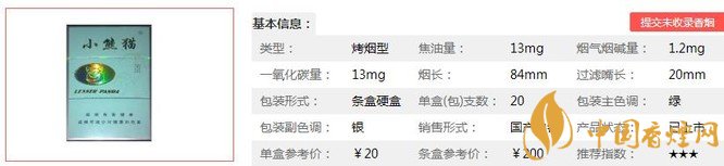 小熊貓綠精品煙支長84mm,過濾嘴長:20mm,煙氣較濃,入口微沖,焦油量較高,降焦技術(shù)不明顯,口感沒有想象中淡。下面我們一起來看小熊貓綠精品的參數(shù)信息:焦油量:13mg 煙堿量:1.2mg 一氧化碳量:13mg