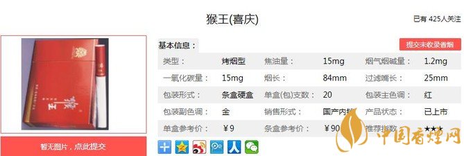 猴王喜慶煙支長84mm,過濾嘴長:25mm,工藝加工精益求精,各種工藝參數(shù)經(jīng)上百次的實驗摸索和重新核定為該產(chǎn)品質(zhì)量的提高和穩(wěn)定提供了堅實保障。下面我們一起來看猴王喜慶的參數(shù)信息:焦油量:15mg 煙堿量:1.2mg 一氧化碳量:15mg