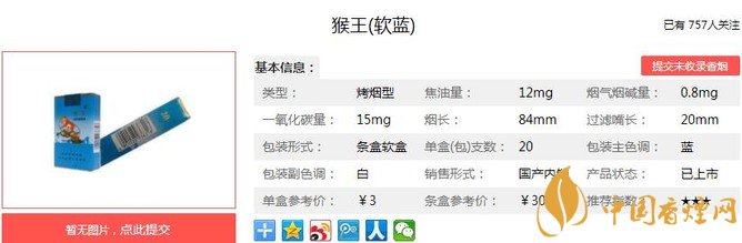 以上便是由香煙網(wǎng)小編為大家介紹的關于猴王軟藍價格及參數(shù) 陜西低價煙中的佼佼者的相關信息,想要了解更多有關內容請點擊:猴王喜慶價格及參數(shù) 猴王喜慶獨家口感分析