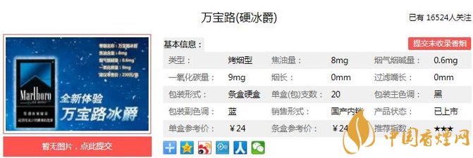萬(wàn)寶路(硬冰爵)煙支長(zhǎng):84mm,混合型,過濾嘴長(zhǎng):25mm,采用凹印印刷,墨層厚實(shí)鮮明純正、層次清晰明顯,套印準(zhǔn)確,反面采用反面定位印刷。背面主圖案為激光全息防偽定點(diǎn)燙,從不同角度能看到兩層次內(nèi)容,效果清晰。下面我們一起來看萬(wàn)寶路(硬冰爵)的參數(shù)信息:焦油量:8mg 煙堿量:0.6mg 一氧化碳量:9mg