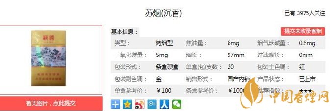 蘇煙(沉香)以沉香奇特的香氣為特征香,以低焦油、低危害、環(huán)保健康為開發(fā)設(shè)計(jì)目標(biāo)和理念。以國(guó)外進(jìn)口和我國(guó)不同地區(qū)優(yōu)質(zhì)煙葉為原料,采用多維的配方技術(shù)調(diào)配和獨(dú)特的加工工藝精制而成,在突出產(chǎn)品煙草自然本香的基礎(chǔ)上,再以名貴的沉香賦予其獨(dú)特的香氣風(fēng)格。下面就由香煙網(wǎng)小編帶大家一起來了解蘇煙沉香的相關(guān)信息。
