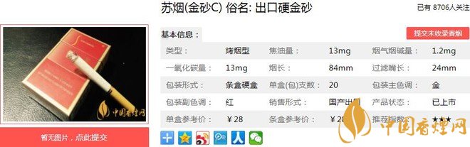 蘇煙(軟金砂C)俗名: 出口硬金砂,外觀包裝設(shè)計(jì)體現(xiàn)了時(shí)代感和高雅、華貴、時(shí)尚、氣派的風(fēng)格。煙絲金黃油潤(rùn),賞心悅目,香氣高雅充足,煙氣柔和豐滿,吃味舒適干凈,形成了“江蘇第一煙”柔、香、雅獨(dú)特風(fēng)格。經(jīng)香煙網(wǎng)小編市場(chǎng)調(diào)查蘇煙軟金砂C售價(jià)為28元/包。