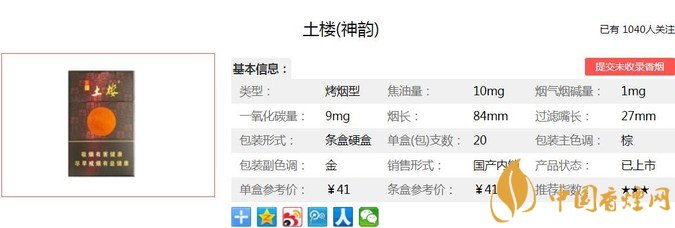 土樓神韻采用永定土樓生態(tài)有機(jī)煙葉為煙絲主料,凝聚客家文化之大成。氣質(zhì)濃厚,底蘊(yùn)深厚,以世界文化遺產(chǎn)之名及中國(guó)傳統(tǒng)藝術(shù)之品,象征客家熱情好客之禮,土樓團(tuán)圓如意之情,地域特色明顯。經(jīng)香煙網(wǎng)小編市場(chǎng)調(diào)查土樓神韻售價(jià)為41元/包。