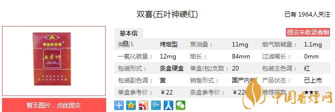 20元檔是各個中煙的主戰(zhàn)區(qū),不僅每個省都有20元檔領軍品類,而且不少省份都有好幾個供消費者選擇,全國區(qū)域都賣的不錯的江湖成名品類也不少,相比而言,五葉神硬紅的銷量就小的多了,但五葉神硬紅在當?shù)匾约皬V東地區(qū)一直有不錯的美譽度。下面就由香煙網(wǎng)小編帶大家一起來了解雙喜(五葉神硬紅)的相關信息。