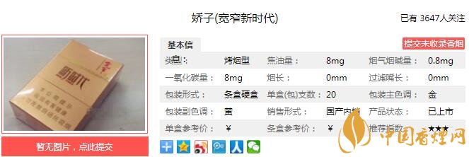 嬌子寬窄新時代具體煙支長度和過濾嘴長度都還沒有準(zhǔn)確的數(shù)據(jù)。煙支濾嘴同樣以金色為主調(diào),但質(zhì)感偏粉偏軟一點。盒子上的V是紅色而煙支實物的V是白色,略意外。下面我們一起來看嬌子寬窄新時代的參數(shù)信息:焦油量:8mg 煙堿量:0.8mg 一氧化碳量:8mg