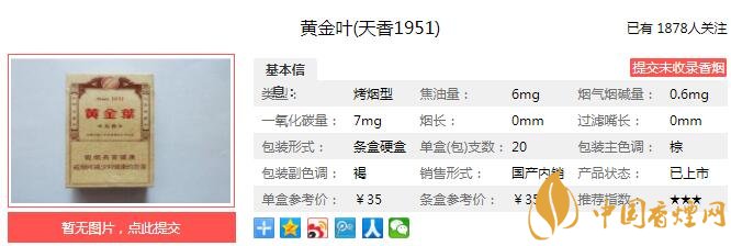 黃金葉天香1951從字面上理解和其本色本香的煙味應(yīng)該是向創(chuàng)牌于1951年“黃金葉”品牌的烤煙傳統(tǒng)致敬,自然本香、尊貴天香、高香低害、舒適輕松、本色包裝、傳承經(jīng)典,古色簡約的包裝風(fēng)格同時(shí)也是對于經(jīng)典的傳承。經(jīng)香煙網(wǎng)小編市場調(diào)查黃金葉天香1951售價(jià)為35元/包。