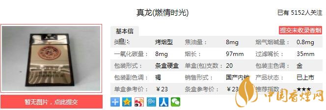 真龍燃情時光煙支長97mm,過濾嘴長35mm,采用硬盒特型盒型,細(xì)長而精致,煙支5.4mm直徑,充分表現(xiàn)成功商務(wù)人士的精致品位和生活方式。下面我們一起來看真龍燃情時光的參數(shù)信息:焦油量:8mg 煙堿量:0.8mg 一氧化碳量:8mg