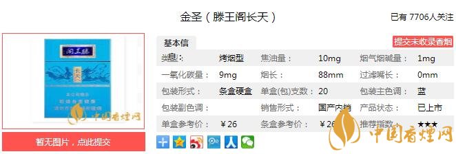 金圣(滕王閣長天)命名來源于《滕王閣序》:“落霞與孤鶩齊飛,秋水共長天一色”。目前我所知道的滕王閣系列,大概有10種。其中,粗支規(guī)格(煙支長度84mm及以下)7種、細(xì)支規(guī)格2種,中支規(guī)格1種。文中的長天,就屬于中支規(guī)格。下面就由香煙網(wǎng)小編帶大家一起來了解金圣(滕王閣長天)的相關(guān)信息。
