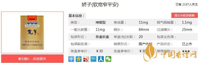 綜合來(lái)說(shuō)嬌子(寬窄平安)的質(zhì)量還是可以保證的。它有著寬窄系列香煙傳統(tǒng)的口感和味道,細(xì)膩而香醇。只是相比其它款式的寬窄,在某一品評(píng)指標(biāo)上,稍有些差距。但是橫向比對(duì)相同價(jià)位其它品牌的香煙,平安的優(yōu)勢(shì),還是存在的,售價(jià)在30元一包。
