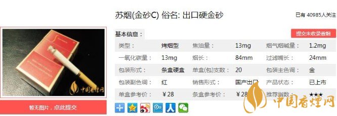 取出煙支,煙絲金黃油潤,煙絲整齊沒有掉絲的情況,煙支的降焦線制作的也是比較精細(xì)。綜合來說,這款香煙降焦明顯,煙氣稍微有一些寡淡,但是還剛剛好。下面便是蘇煙(金砂C)的基本參數(shù):焦油量:13mg 煙堿量:1.2mg 一氧化碳量:13mg.