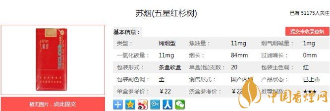 五星紅杉樹降焦線明顯,煙絲濕度較為合適,填充也飽滿,嗅聞煙支有淡淡的蘇系調(diào)香,貌似莫名的果香透著一絲酒香。煙絲緊實,不會出現(xiàn)掉渣的情況,總體不錯。下面便是蘇煙(五星紅杉樹)的基本參數(shù):焦油量:11mg 煙堿量:1.0mg 一氧化碳量:11mg.